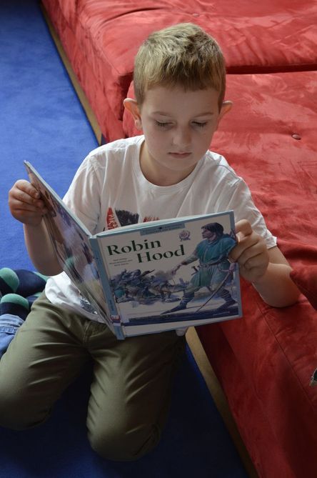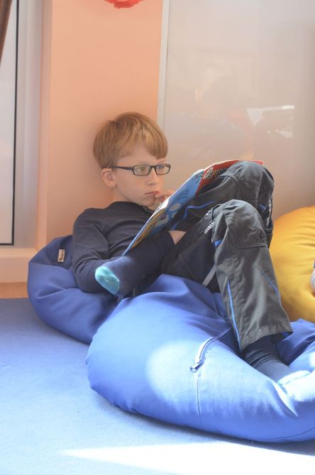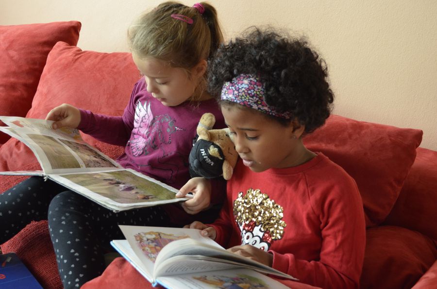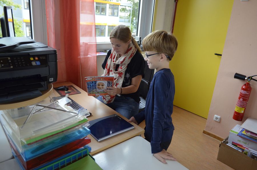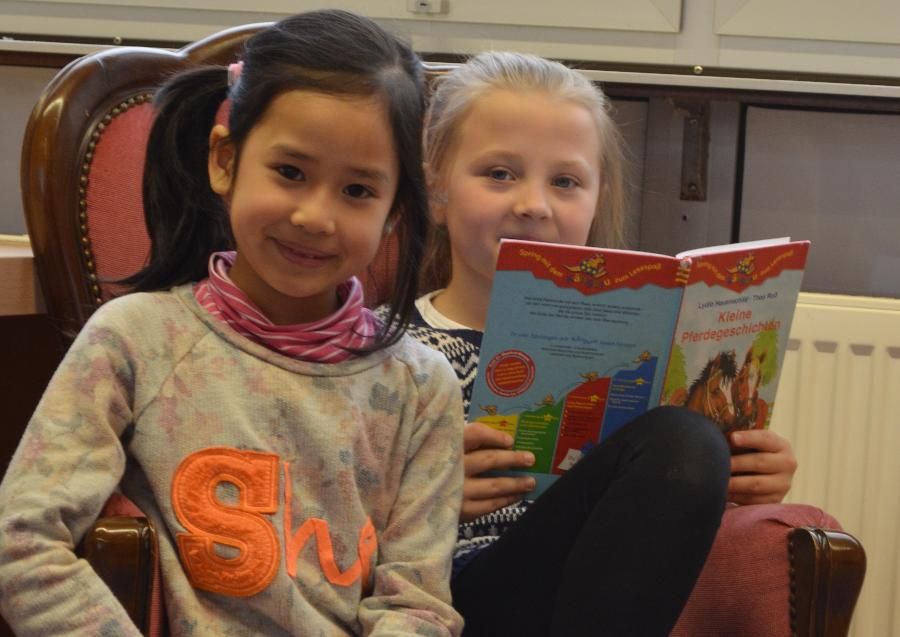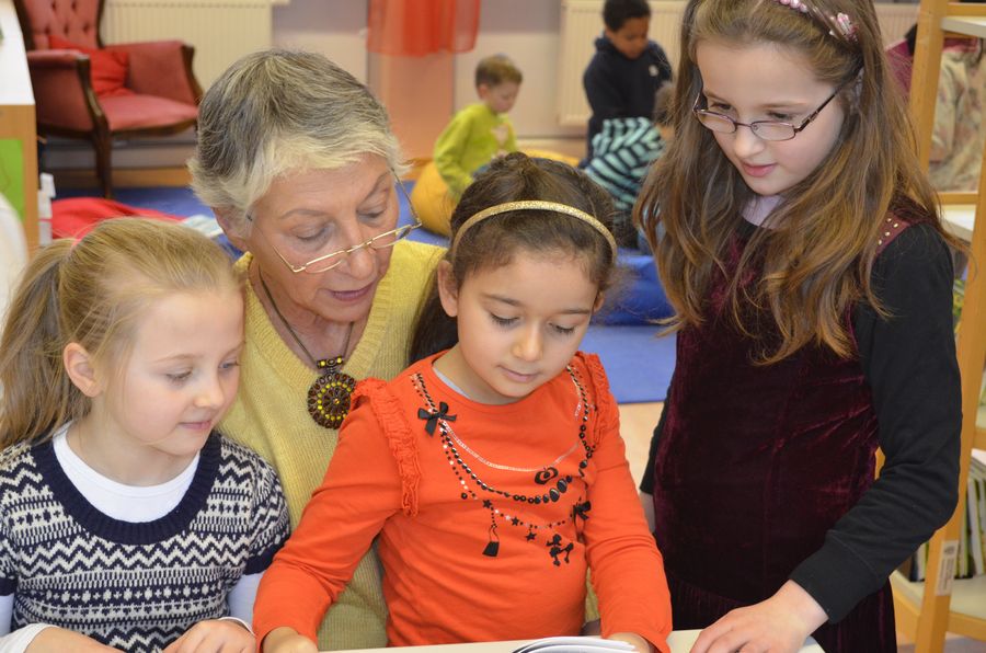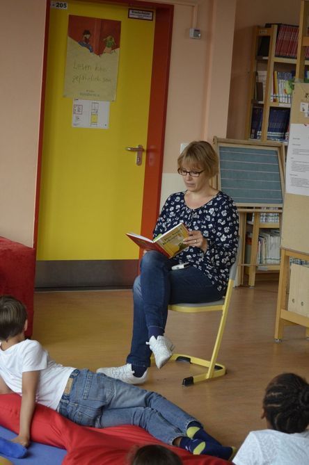 (Und hier - unbezahlbar: "Leseomi" Frau Ludwig, die regelmäßig zum Helfen und Vorlesen in die Bücherei kommt. Vielen Dank dafür!)